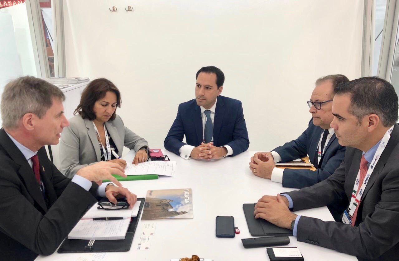 En el marco de la edición 53 de la Exposición Internacional de Aeronáutica y Espacio, el Gobernador sostuvo 5 reuniones con directivos de diferentes empresas en las que planteó que la posición geográfica de Yucatán, la conexión vía marítima que ofrece Puerto Progreso como plataforma de exportación y la conectividad aérea del Aeropuerto Internacional de Mérida permiten la transportación de componentes, insumos y producto terminado en tiempos muy cortos hacia destinos en los Estados unidos, Canadá, Centroamérica, Europa y Asia.