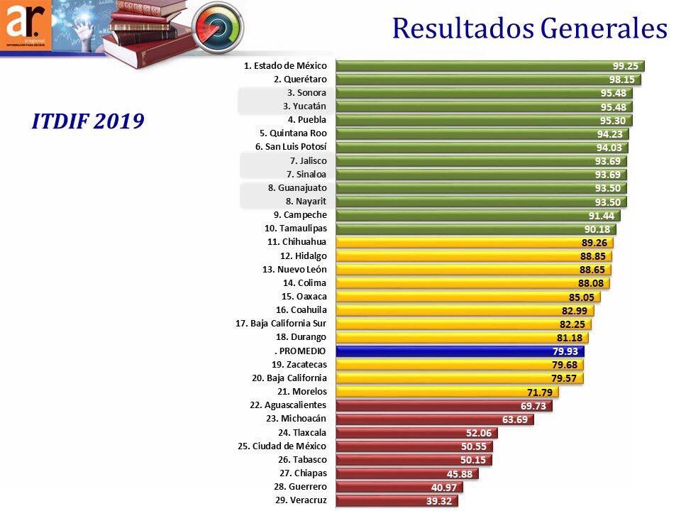 De acuerdo con los resultados del Índice de Transparencia y Disponibilidad de la Información Fiscal de Entidades Federativas (ITDIF), instrumento estadístico de Consultoría Regional que cuantifica la disponibilidad y calidad de la información fiscal generada y publicada por las entidades federativas, el estado tuvo una calificación de 95.48, 16.08 puntos encima de la media nacional, al igual que Sonora, y sólo por debajo de Querétaro, con 98.15, y el Estado de México, con 99.25 unidades.