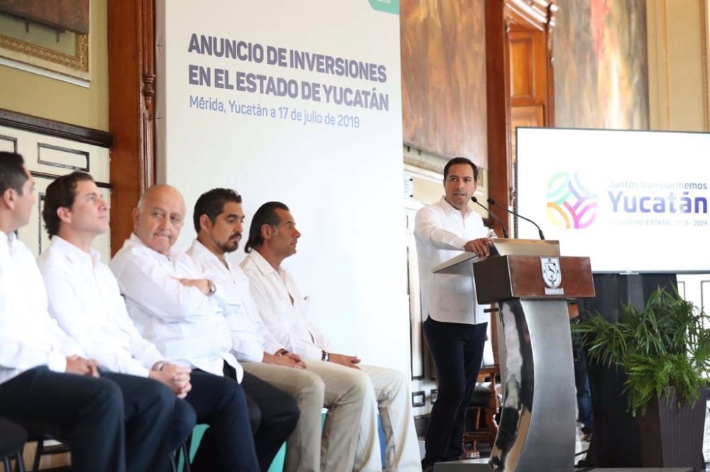Mérida, Yucatán, 17 de julio de 2019.- Un total de 9 empresas de capital local, nacional e internacional dedicadas a los sectores inmobiliario, agroindustrial, hotelero, médico y especializado en logística de carga, sistemas de ventilación, entre otros, realizarán en Yucatán una inversión de 18,169 millones de pesos, cifra 4 veces mayor a la de 5,500 millones de pesos presentada en enero pasado, para la generación de más 6,440 empleos directos y 19,420 indirectos, con lo que ya se logró acumular en los primeros 9 meses de esta administración una certeza de inversión por más de 23,700 millones de pesos y la creación de 17,010 fuentes de trabajo directas y 54,120 indirectas, anunció el Gobernador Mauricio Vila Dosal.