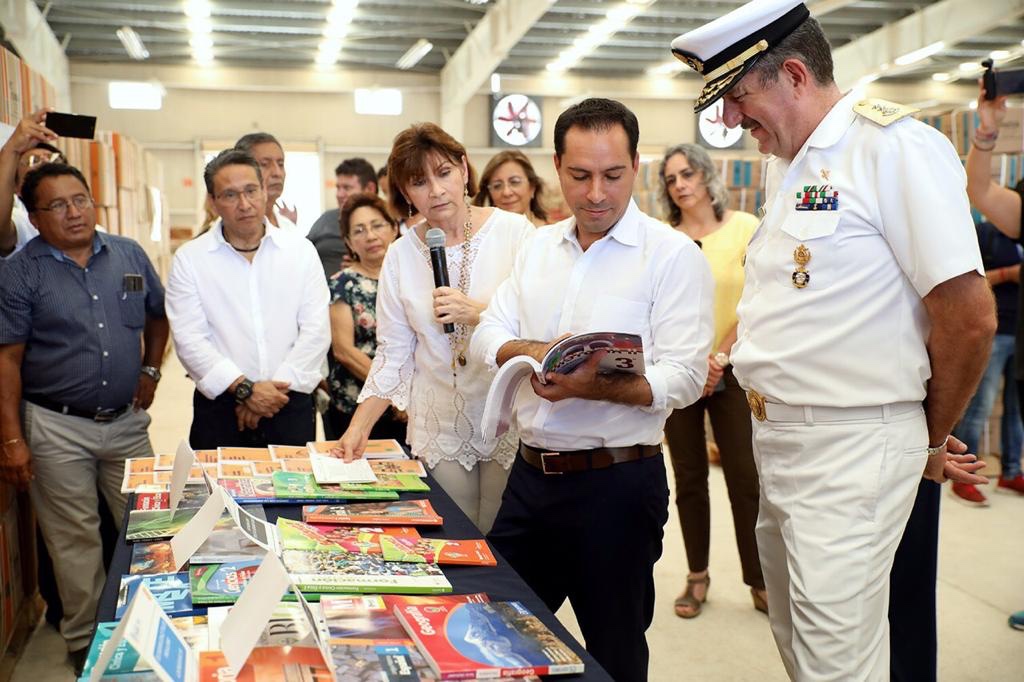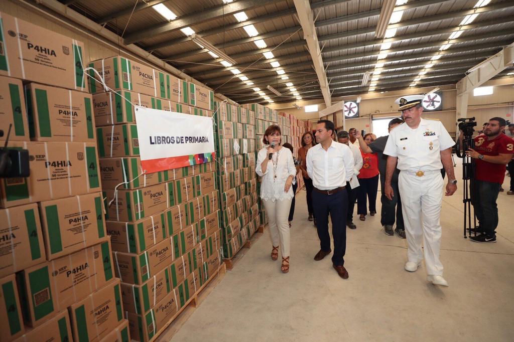 En la bodega de distribución de la Secretaría de Educación Estatal (Segey), Vila Dosal, junto con la titular de esta dependencia, Loreto Villanueva Trujillo y el comandante de la IX Zona Naval, vicealmirante Carlos Humberto Lanz Gutiérrez, supervisó el proceso de organización de los materiales y dio el banderazo de salida a los camiones cargados con libros de texto de diversas materias para los niveles de preescolar, primaria, secundaria, telesecundaria y telebachillerato, que incluyen las modalidades en lengua maya para educación indígena, braille y macrotipo para educación especial.