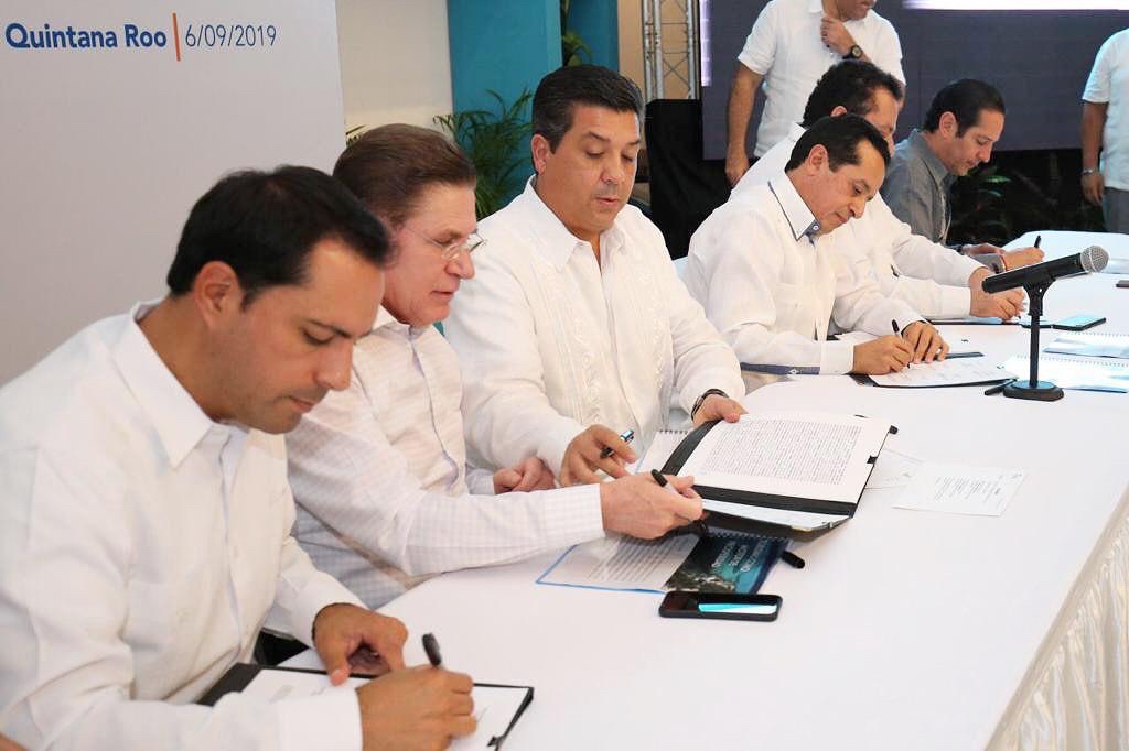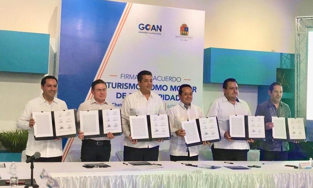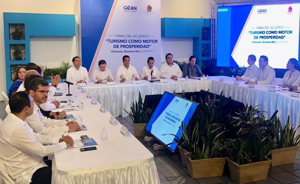 Chetumal, Quintana Roo, 6 de septiembre de 2019.- El Gobernador Mauricio Vila Dosal firmó este día el acuerdo “Turismo como Motor de Prosperidad”, agenda conjunta de trabajo con los otros 8 Gobernadores integrantes de la Asociación Gobiernos Estatales (GOAN), cuyo objetivo es generar estrategias que fomenten la inversión en el sector turístico y, con ello, impulsar el desarrollo económico de los estados.