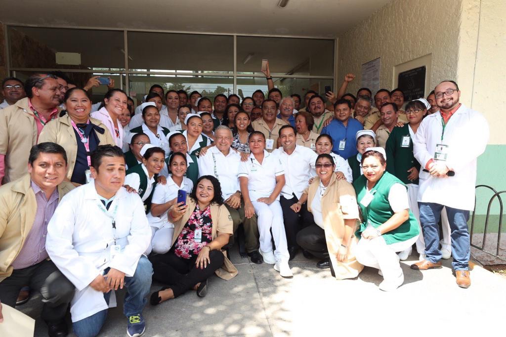 En su mensaje, el Presidente afirmó que su visita a Yucatán también es para fortalecer el derecho que todos tienen a la salud en 4 compromisos fundamentales, que con un presupuesto de 40 mil millones de pesos se buscará que no haya carencias de medicinas en las unidades médicas, centros de salud y hospitales; que se garantice plantilla completa de profesionales de la salud en los nosocomios; mejorar y modernizar como equipo e instalaciones adecuadas y, por último, la basificación de todos los trabajadores de la salud.