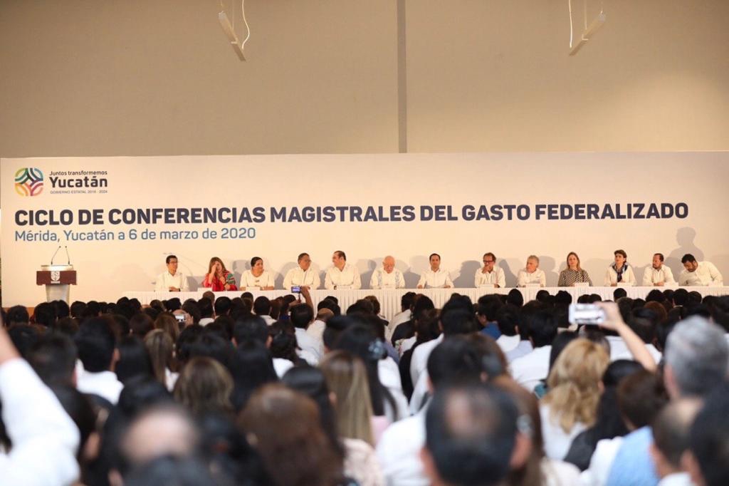 Mérida, Yucatán, 6 de marzo de 2020.- Vamos a continuar por este camino de transparencia y eficiencia en el ejercicio de los recursos públicos, otorgando mayores recursos a los programas que lleven más beneficios a la población, como nos comprometimos con la gente, afirmó el Gobernador Mauricio Vila Dosal al inaugurar, junto con el Auditor Superior de la Federación, David Rogelio Colmenares Páramo, el Ciclo de Conferencias Magistrales del Gasto Federalizado.