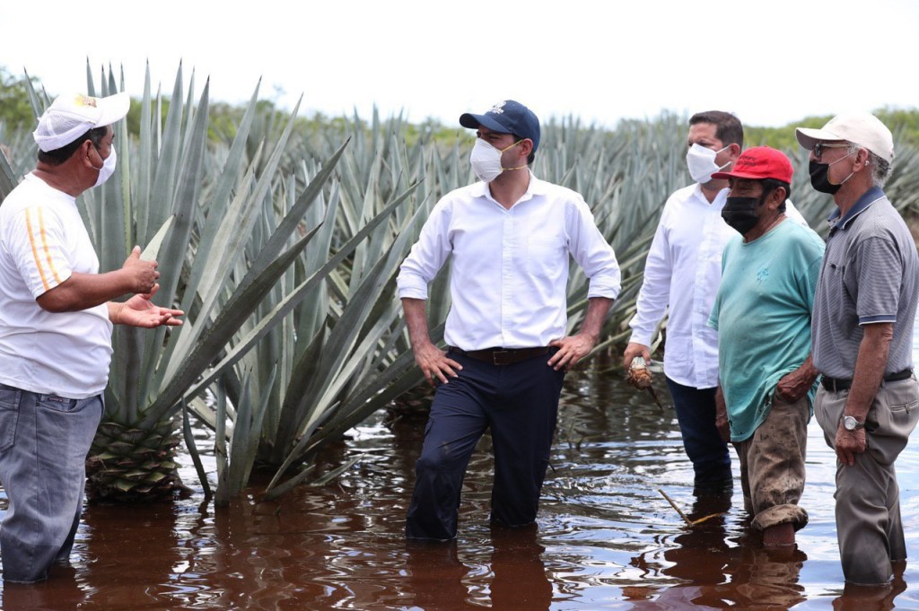 En esa localidad, Vila Dosal también recorrió los plantíos de henequén, en donde pudo enterarse que los vástagos de este tipo de agave se pudrirán debido a los campos de cultivo inundados, por lo que son pérdida total. En el lugar, el titular de la Secretaría de Desarrollo Rural (Seder), Jorge Díaz Loeza, informó que se estima que 2,000 hectáreas de este cultivo han sido afectadas en esta región del estado.