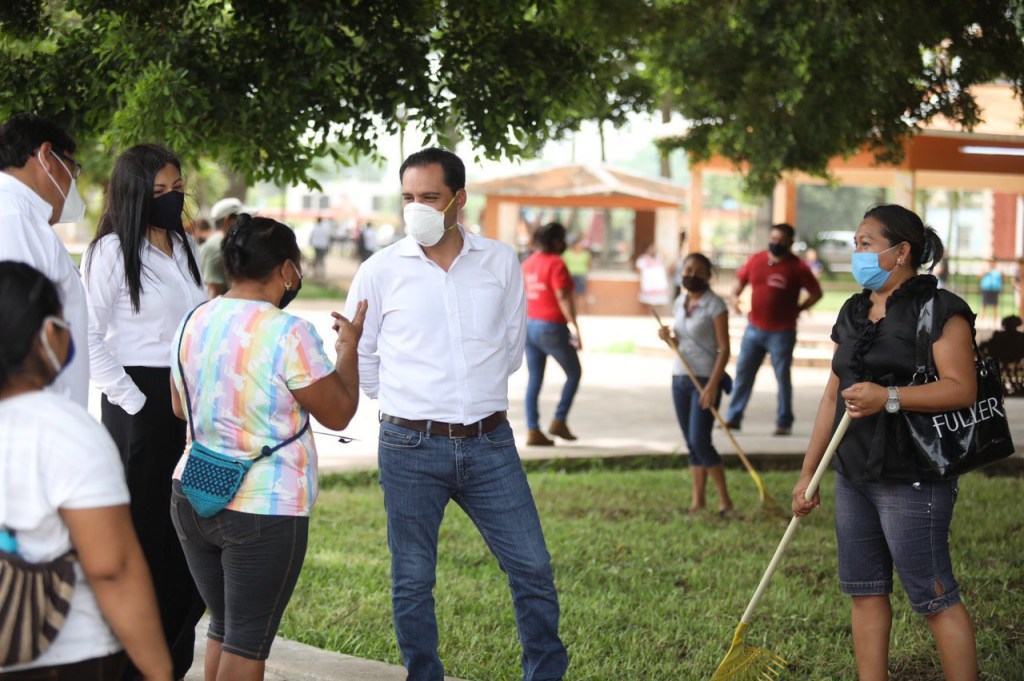 Tinum, Yucatán, 24 de junio de 2020.- El Gobernador Mauricio Vila Dosal continuó con sus recorridos por el interior del estado para verificar las labores de limpieza, desinfección y recuperación de espacios públicos que, dentro del Programa Emergente de Apoyo Comunitario, realizan 28,000 habitantes de 75 municipios de Yucatán que resultaron afectados por el paso de las tormentas tropicales “Amanda” y “Cristóbal”, trabajos por los cuales recibirán un apoyo económico de 2,500 pesos durante un mes.