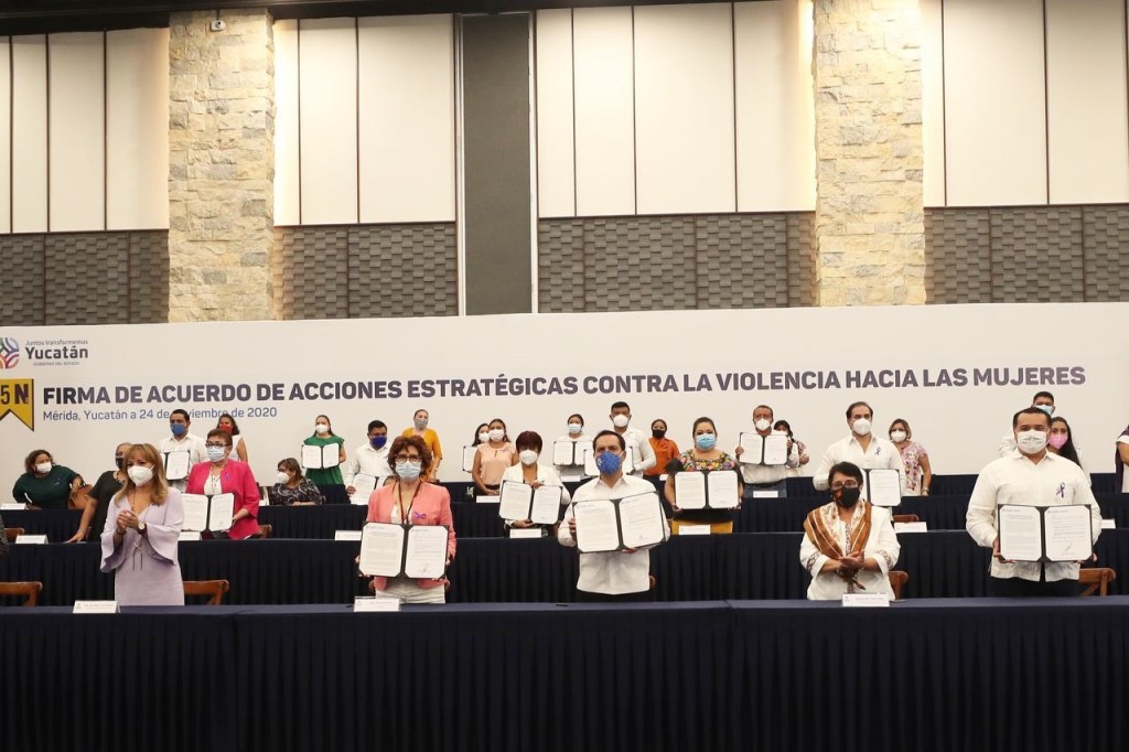 Mérida, Yucatán, 24 de noviembre de 2020.- En el marco del Día Internacional de la Eliminación de la Violencia contra la Mujer, que se conmemora mañana 25 de noviembre, el Gobernador Mauricio Vila Dosal y los Ayuntamientos de 15 municipios del estado firmaron el «Acuerdo de Acciones Estratégicas contra la Violencia hacia las Mujeres”, que tiene como objetivo fortalecer las instancias municipales de atención a este sector de la población a través de estrategias conjuntas de capacitación y acompañamiento que contribuyan a combatir esta problemática.