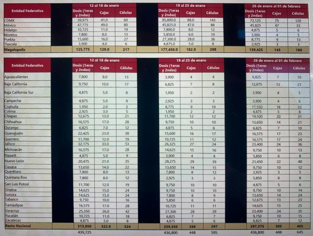 Con base en lo programado, se prevé que del 12 al 18 de enero lleguen al estado 10,725 vacunas; de 19 al 25 del mismo mes otras 6,825; y del 26 de enero al 1 de febrero 9,750, lo que hacen un total de 27,300.