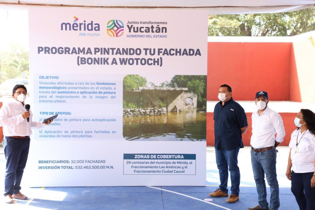 Mérida, Yucatán, 27 de febrero de 2021.- Familias de 29 comisarías y 2 fraccionamientos de las zonas de Mérida que resultaron más afectadas por las inundaciones que ocasionaron las tormentas y huracanes del año pasado, podrán acceder a un apoyo para pintar el frente de su vivienda, a través del programa “Pintando tu fachada”, que pusieron en marcha este día el Gobernador Mauricio Vila Dosal y el alcalde esta ciudad, Renán Barrera Concha.