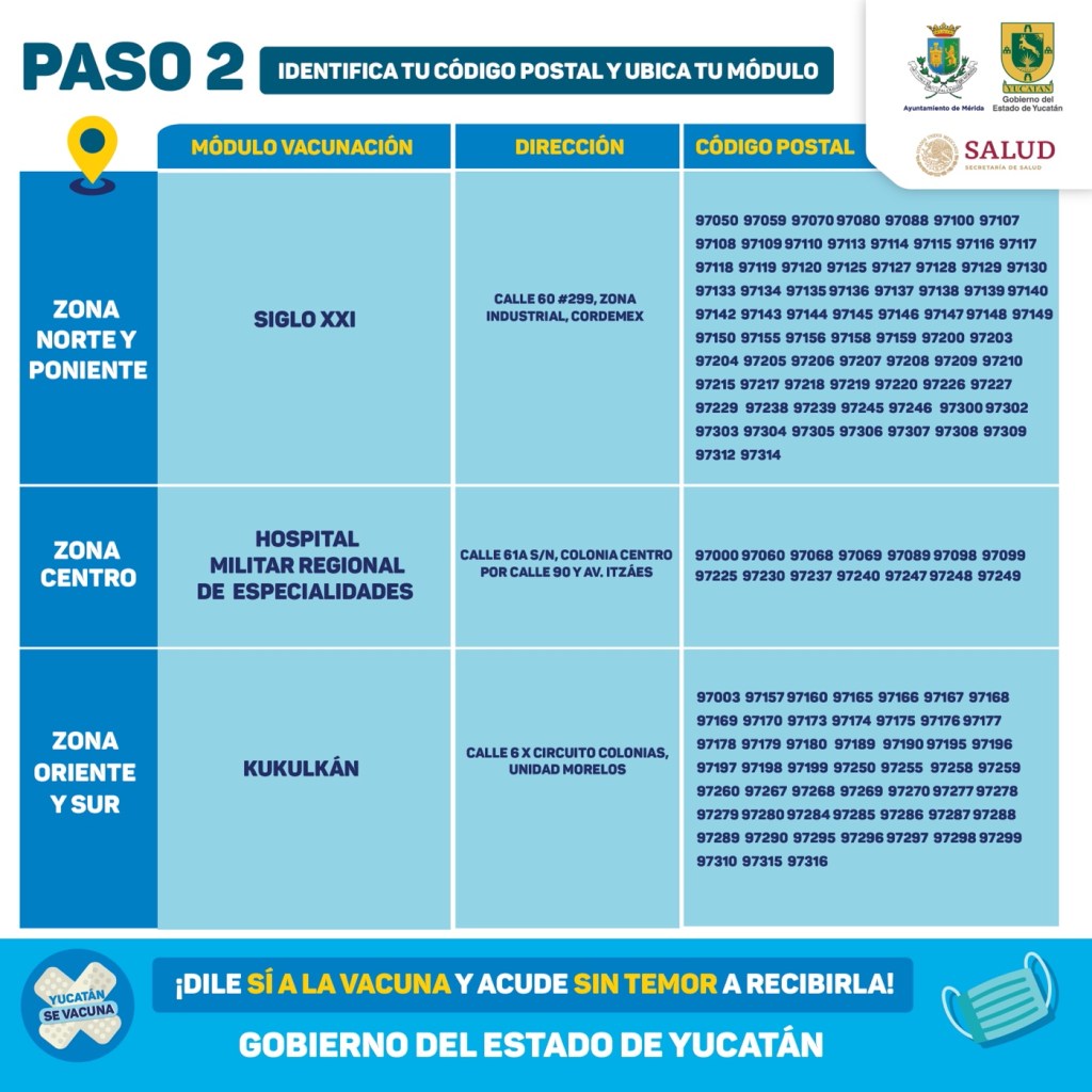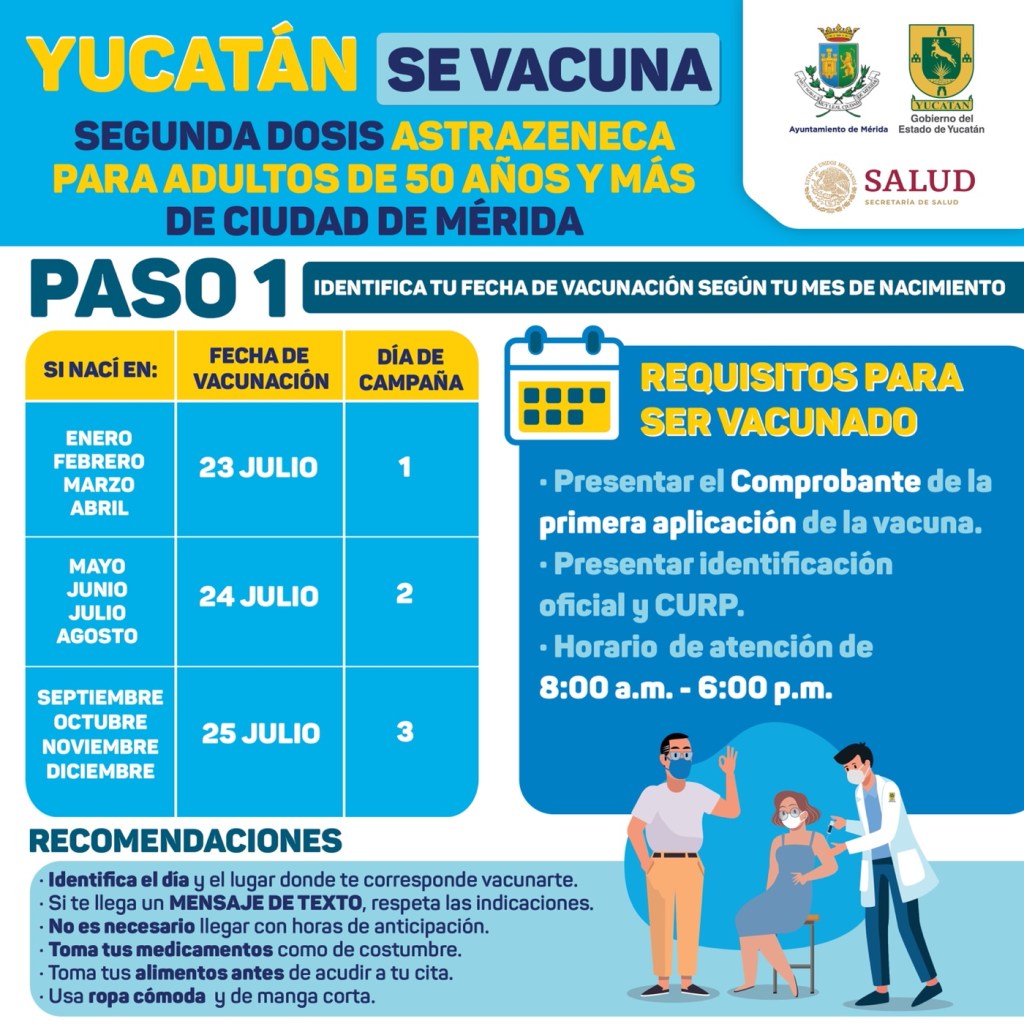 En el caso de Mérida, la SSY puntualizó que el proceso de aplicación de la segunda dosis a las personas de 50 a 59 años se estará llevando del viernes 23 al domingo 25 julio en los macrocentros habilitados en el Centro de Convenciones Yucatán Siglo XXI y la Unidad Deportiva Kukulcán, así como en el módulo del Hospital Militar Regional de Especialidades.