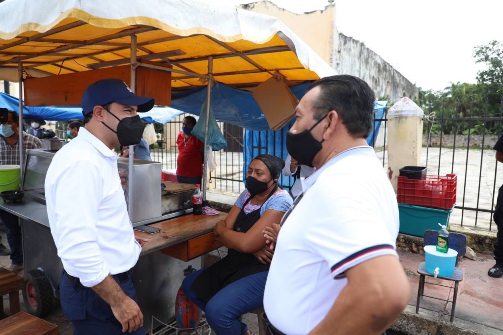 Antes de continuar su agenda de trabajo, Vila Dosal saludó a los comerciantes de puestos de comida frente al Palacio Municipal, quienes le externaron su agradecimiento por constatar personalmente las afectaciones que en su paso provocó «Grace».
