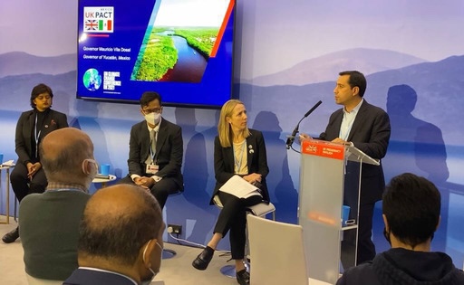 Glasgow, Escocia, 5 de noviembre de 2021.- En el marco de la COP26, el Gobernador Mauricio Vila Dosal gestionó y acordó con el Gobierno del Reino Unido, continuar y ampliar la colaboración con Yucatán, mediante el financiamiento a proyectos que contribuyan con los esfuerzos para reducir los efectos del cambio climático.