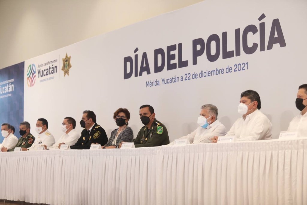 Mérida, Yucatán, 22 de diciembre de 2021.- Por su lealtad, valentía y compromiso con salvaguardar la paz que prevalece en Yucatán, así como su entrega para salir adelante, al hacer frente a la pandemia y los desastres naturales que afectaron al territorio, el Gobierno del Estado reconoció la invaluable labor de las y los elementos de la Secretaría de Seguridad Pública (SSP), que han hecho que, hoy, la entidad esté de pie y más fuerte que nunca.