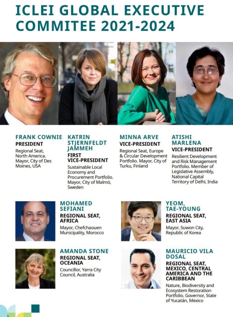 El Comité Ejecutivo Global está presidido por Frank Cownie, alcalde de la ciudad de Des Moines, Estados Unidos. También están Katrin Stjernfeldt Jammeh, alcaldesa de la ciudad de Malmö, Suecia, primera vicepresidenta¸ y por Minna Arve, alcaldesa de la ciudad de Turku, Finlandia, y Atishi Marlena, miembro de la Asamblea Legislativa, Territorio Capital Nacional de Delhi, India.