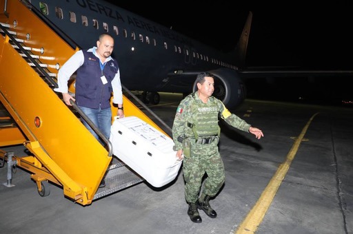 Acompañado del Capitán Segundo de Fuerza Aérea Meteorólogo, Emmanuel Velázquez Trejo y el coronel de Zapadores Óscar Hernández Oviedo, Comandante del Séptimo Batallón de Ingenieros de Combate, el funcionario estatal constató la descarga de los insumos a cargo del personal del Ejército que los colocó en un camión thermoking de la SSY para su traslado al almacén y posterior distribución.