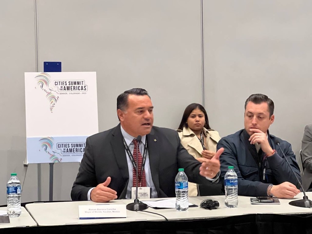 En esta mesa que forma parte de la agenda de actividades de la Cumbre de Ciudades de las Américas, que se realiza en la ciudad de Denver, Colorado, EUA, participaron los alcaldes William Chamat Dau, de Cartagena, Colombia; Farrah Khan, de Irvine, California; Luis Donaldo Colosio Riojas, de Monterrey, Nuevo León y Renán Barrera Concha de Mérida, Yucatán, quien durante su intervención explicó que el Consejo de Seguimiento del Presupuesto se reúne cada tres meses para analizar el cumplimiento y la transparencia de las acciones municipales.