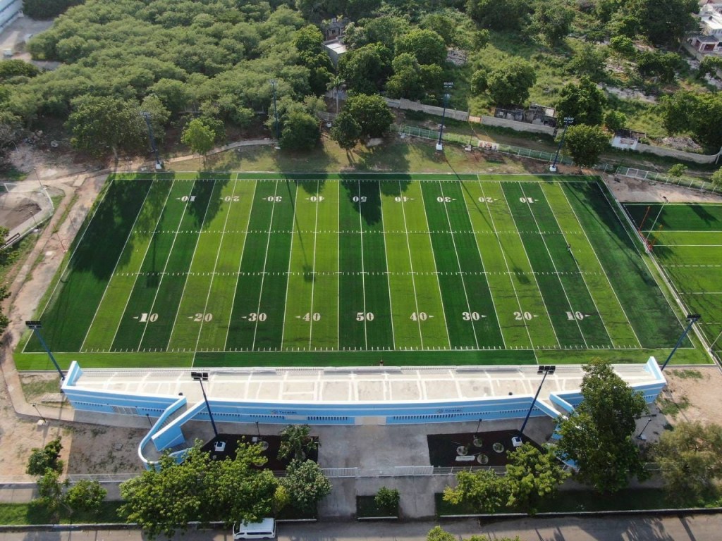 En lo que a los campos de fútbol americano, únicos en su tipo en el estado, y de tochito bandera respecta, se realizó la construcción de la base hidráulica y se suministró de luminarias para seguridad de los usuarios y de pasto sintético con un área de 6362.29 metros cuadrados. También, se colocaron y dio mantenimiento a las porterías de gol de campo y se rehabilitaron las zanjas colectoras, con el desazolve de pozos pluviales existentes.