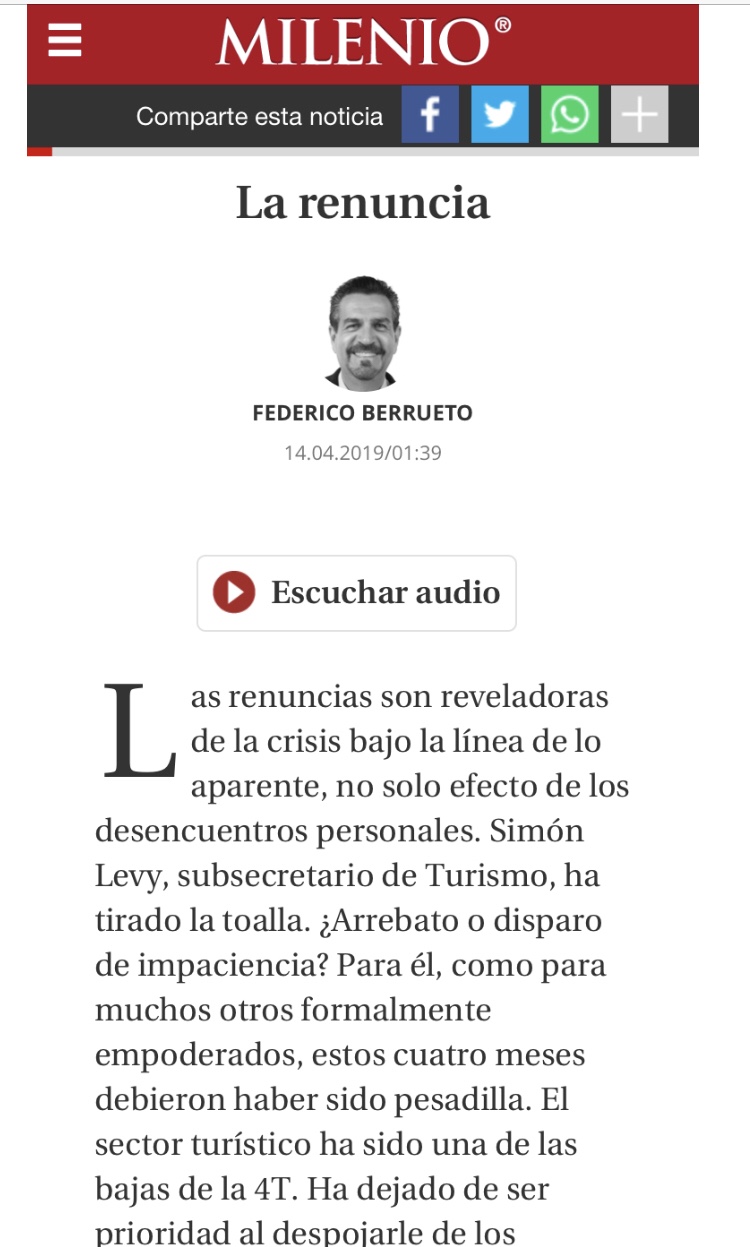 La renuncia de Simón Levy no solo dibuja personajes y formas viciadas de ejercicio del poder. También revela la crisis inducida a uno de los más prometedores sectores de la economía nacional; la joya de la corona para el empleo, el ingreso de divisas y la digna promoción de México y los mexicanos.